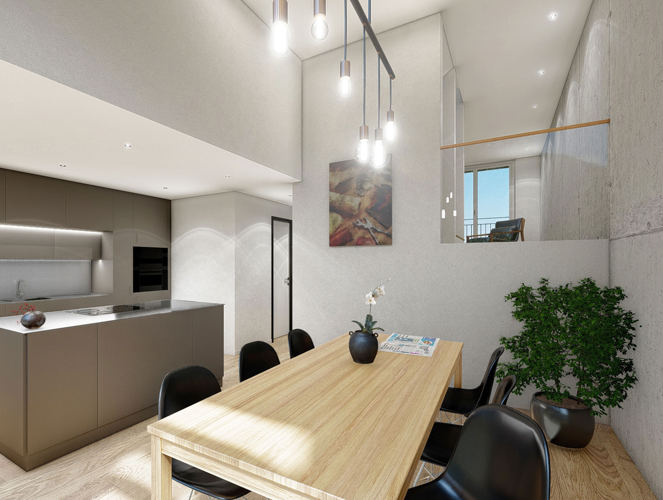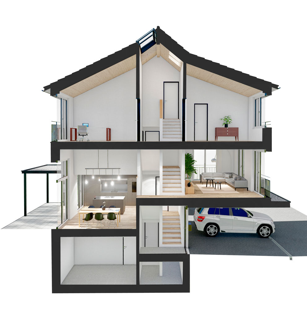 Durch die abgestufte Umgebungsgestaltung sind die Häuser in der Höhe halbgeschossig versetzt. Die Mittelschicht der Reihenhäuser bildet die Erschliessung der Geschosse und den Nasszellen. Durch das Versetzen der Geschosse entstehen spannende Raumsequenzen wie das überhohe Esszimmer, welches durch eine kleine Galerie eine Verbindung zum Wohnzimmer herstellt. Der Wohnbereich ist räumlich abgetrennt von der Küche und vom Essraum. So können die Bewohner verschiedene Ausblicke und Sonnenlichteinfälle in verschiedene Himmelsrichtungen geniessen.