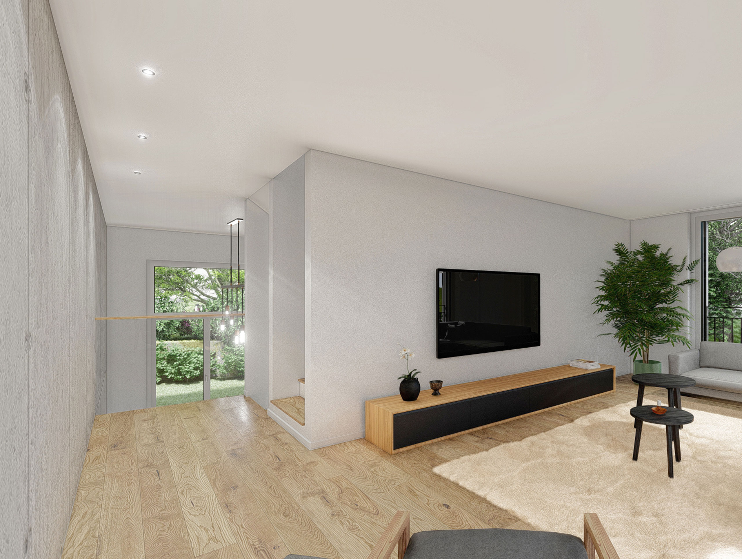 Das Wohnkonzept der Reihenhäuser sieht es vor, dass die Parkierung als Carport direkt auf Strassenniveau liegt. Es stehen pro Haus jeweils zwei gedeckte Parkplätze und ein Besucherparkplatz zur Verfügung. Der gedeckte Carport bildet zugleich den Eingang für die einzelnen Reihenhäuser. Durch die steigende Topografie südwärts wird die Umgebung der Häuser angehoben. Jedes Reihenhaus hat seinen eigenen Grünraum, auf dem zum Beispiel ein Gartenbeet angelegt werden kann. Bepflanzungen sollen die Parteien voneinander separieren. Eine kleine Stufe trennt die Grünfläche zu den teilüberdeckten Sitzplätzen.